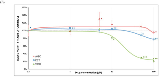 (A) Antidepressant-induced MAO-A inhibition. The relative activity is displayed as 100% activity of the control sample. Statistical significance was tested using a one sample t-test that mean value is equal to 100% and is expressed as * p ˂ 0.05. ** p ˂ 0.01. *** p ˂ 0.001. The half-maximal inhibitory concentration (IC50), Hill slope and residual activity was calculated (Table 2). Drugs concentrations are expressed in μM. AGO—agomelatine, KET—ketamine, VOR—vortioxetine. (B) Antidepressant-induced MAO-B inhibition. The relative activity is displayed as 100% activity of the control sample. Statistical significance was tested using a one sample t-test that mean value is equal to 100% and is expressed as * p ˂ 0.05. ** p ˂ 0.01. *** p ˂ 0.001. The half-maximal inhibitory concentration (IC50), Hill slope and residual activity was calculated (Table 2). Drugs concentrations are expressed in μM. AGO—agomelatine, KET—ketamine, VOR—vortioxetine.
