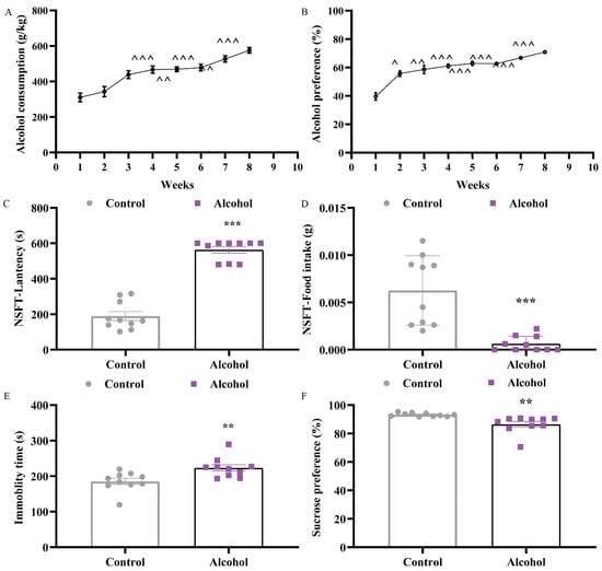 Alcohol exposure induced depressive-like behaviors in mice. (A) Alcohol consumption in mice across 8 weeks of alcohol, (B) alcohol preference in mice across 8 weeks of alcohol, (C) immobility time of mice in tail suspension test, (D) latency to feed in novelty-suppressed feeding test, (E) the food intake in novelty-suppressed feeding test, and (F) the sucrose preference of mice in sucrose preference test. Data are presented as the mean ± SEM, and one-way repeated measures ANOVA was performed for alcohol consumption and preference data with Sidak’s post hoc test. n = 10 for per group, ^ p < 0.05, ^^ p < 0.01, ^^^ p < 0.001 compared with week 1. Student’s t test was applied to other animal experiments, ** p < 0.01, *** p < 0.001 vs. control group.