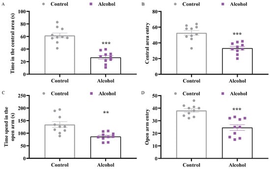 Alcohol exposure induced anxiety-like behaviors in mice. (A) The time of central area entries in open field test, (B) the time in the central area in open field test, (C) the number of entries in the open arms in zero maze test, and (D) the time spent in the open arms in zero maze test. Data are presented as the mean ± SEM, n = 10 for per group. Statistical analyses were carried out by Student’s t test, ** p < 0.01, *** p < 0.001 vs. control group.
