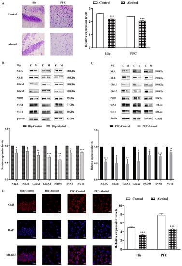 Alcohol exposure downregulated the expression of synapse-related proteins in the hippocampus (Hip) and prefrontal cortex (PFC). (A) Nissl staining of Hip and PFC (magnification: 400×), (B) Western blot analyses for synapse-related proteins in Hip, (C) western blot analyses for synapse-related proteins in PFC, and (D) immunohistochemistry (IHC) showing N-methyl-d-aspartic acid receptor 2B (NR2B) (red) staining in the Hip and PFC (magnification: 400×), nuclei are stained with diamidino-2-phenylindole (DAPI) (blue). Data are presented as the mean ± SEM. Statistical analysis was carried out by Student’s t test, * p < 0.05, ** p < 0.01, *** p < 0.001 vs. control group.