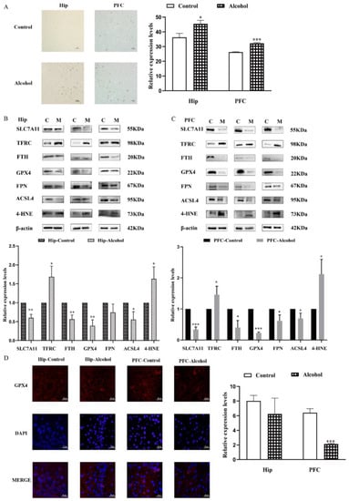 The ferroptosis pathway was involved in alcohol-induced mental disorder. (A) Iron staining of hippocampus (Hip) and prefrontal cortex (PFC) (magnification: 400×), (B) western blot analyses for ferroptosis-related proteins in Hip, (C) western blot analyses for ferroptosis-related proteins in PFC, and (D) immunohistochemistry (IHC) showing glutathione peroxidase 4 (GPX4) (red) staining in the Hip and PFC (magnification: 400×), nuclei are stained with diamidino-2-phenylindole (DAPI) (blue). Data are presented as the mean ± SEM. Statistical analysis was carried out by Student’s t test, * p < 0.05, ** p < 0.01, *** p < 0.001 vs. control group.