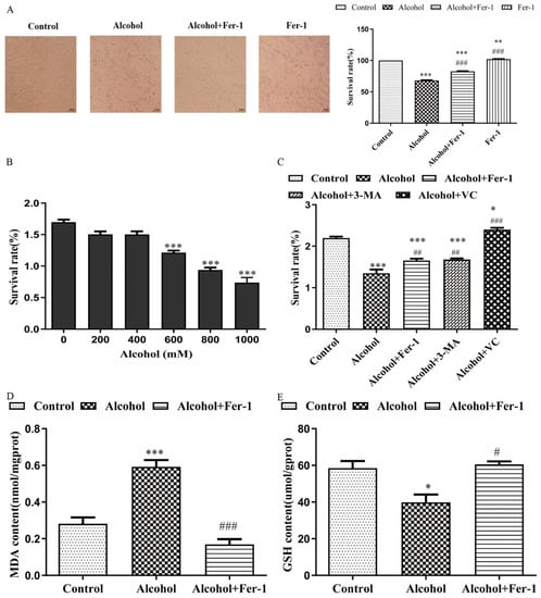Fer-1 improved alcohol-induced cell death in vitro. (A) The effect of alcohol and ferrostatin-1 (Fer-1) on primary cultured neural cells, (B) cytotoxicity of alcohol to Neuro 2a (N2A) cells, (C) cytotoxicity of different inhibitors to N2A cells, Fer-1 (10 μM), 3-methyladenine (3-MA) (1 mM), vitamin C (VitC) (200 μM), (D) the level of lipid peroxides malondialdehyde (MDA) in N2A cells, (E) the level of L-glutathione (GSH) in N2A cells. Data are presented as the mean ± SEM. Statistical analysis was carried out by one-way ANOVA for multiple comparisons with Tukey post hoc test, * p < 0.05, ** p < 0.01, *** p < 0.001 vs. control group; # p < 0.05, ## p < 0.01, ### p < 0.001 vs. alcohol group.