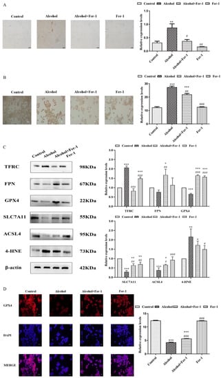 To further verify the cell ferroptosis induced by alcohol, the primary cultured neuron and N2A cells treated with alcohol and/or Fer-1 were assessed by iron staining. We found that the positive stain areas and the integrated absorbance of iron staining in the alcohol-only treated group were both significantly increased compared with the control group of primary cultured neuron (F = 6.690, p = 0.0065) and N2A cells (F = 23.980, p < 0.0001). However, Fer-1 significantly decreased iron accumulation in contrast with the alcohol-only treated group (Fprimary cultured neuron = 5.961, p = 0.0125; FN2A = 8.556, p = 0.0014) (Figure 6A,B). In addition, Fer-1 significantly increased the expressions of GPX4 (F = 42.470, p < 0.0001), SLC7A11 (F = 7.494, p = 0.0032), ACSL4 (F = 4.663, p = 0.0431) and FPN (F = 6.274, p = 0.0094) compared to the alcohol group of N2A cells. Alcohol alone significantly expanded the protein expression of TFRC (F = 23.090, p < 0.0001) and 4-HNE (F = 8.008, p = 0.0021) in N2A cells compared to the control group, while Fer-1 significantly decreased the levels of these proteins (FTFRC = 26.910, p < 0.0001, F4-HNE = 3.085, p = 0.207)) (Figure 6C). At the same time, the alcohol-only treated group had decreased GPX4 levels in contrast with the control group (F = 151.200, p < 0.0001), as determined by immunohistochemistry, and that number of cells positive for GPX4 was increased in the alcohol plus Fer-1 group compared to the alcohol-only treated group (F = 26.630, p < 0.0001) (Figure 6D).