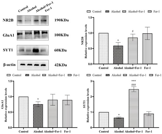 Inhibition of ferroptosis ameliorated synaptic plasticity. Protein expressions of NR2B, GluA1, and SYT1 were analyzed by Western blot. Data are presented as the mean ± SEM. Statistical analysis was carried out by one-way ANOVA for multiple comparisons with Tukey post hoc test, * p < 0.05, *** p < 0.001 vs. control group; # p < 0.05, ### p < 0.001 vs. alcohol group.