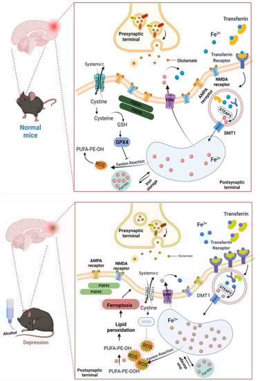 AUD is considered as a chronic recurrent encephalopathy and is the most prevalent mental disorder in the world []. The withdrawal symptoms of AUD showed impaired physical function and negative emotional responses, such as hypothymergasia and anxiety []. This comorbidity increases the complexity of diagnosis and treatment []. The current medical therapies, including selective serotonin reuptake inhibitors (SSRIs), tricyclic antidepressants, benzodiazepines, prazosin, etc., can hardly be regarded as effective therapeutic methods []. It took 3–6 weeks for drug treatment to improve AUD patients’ mood, and about 50% of patients with depression could not be cured, even suffering repeated outbreaks []. It reminded us that AUD comorbidity with depression and anxiety might have other more complex biological mechanisms. As a result, a deeper understanding of the processes behind alcohol-induced depressive and anxiety-like behaviors is critical for developing innovative treatment options. In this study, we found that ferroptosis may be involved in depressive and anxiety-like behaviors during early abstinence. Ferroptosis inhibitor ferrostatin-1 significantly prevented alcohol-induced neuron death in vitro. Figure 8 shows the mechanism of ferroptosis that were involved in the depressive and anxiety-like behaviors in mice induced by alcohol exposure.