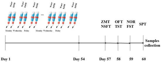 C57BL/6 mice (Beijing Vital River laboratory; 8–9 weeks, half male and half female) were acclimated for at least 7 days before treatment. All mice were singly housed in a 12 h reverse light-dark cycle, with free access to food and water during the study. Notably, mice were divided randomly into the control group and alcohol group, and the intermittent access to alcohol (IAA) two-bottle choice drinking procedure, and behavioral testing were performed in Figure 9. Briefly, on Monday, Wednesday, and Friday, alcohol group mice were provided two bottles (single bottles of 20% ethanol and water) for 24 h across 8 weeks. Both bottles containing tap water were given to the control group. To avoid side preference, the bottle position was swapped every day. The bottles were weighed every day and mice were weighed weekly. All animal experiment procedures were approved by the Ethics Committee of Jianghan University (JHDXLL2020-009). Additionally, all methods were carried out in accordance with Jianghan University guidelines and regulations. This study is in accordance with ARRIVE guidelines for the reporting of animal experiments.