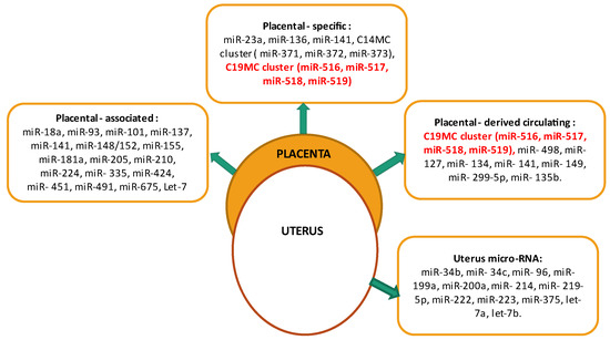 According to studies on the pathogenesis of pregnancy complications related to the presence of trophoblast (PIRC—placental complications associated with placental insufficiency) [13], microRNAs can be divided into four groups: placental-associated; placental-specific; placenta-derived circulating and uterus microRNA. Detection of C19MC miRNAs expression in placental tissue and in maternal circulation confirms the involvement of C19MC in the physiological and abnormal development of the placenta (Figure 1) [13,14,15].