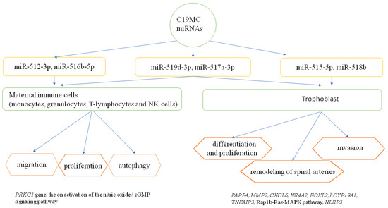 Chaiwangyen et al. indicated the importance of miR-519d-3p in the formation of immune tolerance in pregnancy by influencing the proliferation and migration of maternal immune cells (monocytes, granulocytes, T-lymphocytes and NK cells) [87]. However, it should be emphasized that humoral factors and miRNAs contained in exosomes also affect the maternal vascular endothelium, stimulating it to release cytokines and activating neutrophil adhesion, and as a result, inducing a systemic inflammatory response characteristic of advanced PE [43]. In addition, Delorme Axford et al. clearly indicated that C19MC miRNAs (miR517-3p, miR-512-3p, or 516b-5p) can increase the resistance of maternal cells at the fetal–mother interface to viral infection, by induction of autophagy [88,89]. Moreover, miR-517a-3p was found to influence the activation of maternal T-lymphocyte and NK cell proliferation, and via the PRKG1 gene, the on activation of the nitric oxide/cGMP signaling pathway [89].