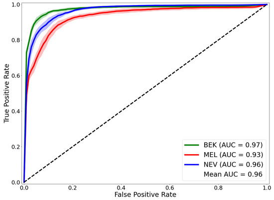 We ran each of our experiments five times and the results were aggregated to generate an ROC curve of model performance. As shown in Figure 1, our framework performed well on all classes of lesions, far above a hazardous prediction (AUROC = 0.5). Our approach achieved a mean AUROC of 96% on the entire test dataset. Looking at the performance of each class individually, the class with the highest AUROC is the benign keratosis class with an AUROC value of 97%. The Nevus class obtained an AUROC of 96%. The class with the lowest performance was the melanoma class with an AUROC of 93%.