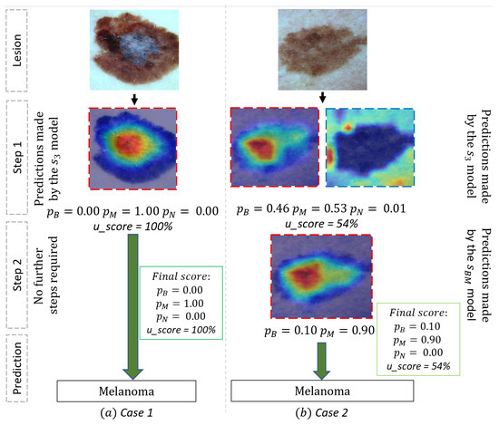We further presented our results to a dermatologist collaborating with us in our laboratory for an evaluation in a real clinical context of our tool’s use case. We present in Figure 2 two illustrative examples chosen by the dermatologist. Lesion 1 (see (a) in Figure 2) is a dermoscopic image of a typical Melanoma with a high prediction () for this diagnosis and low prediction for the two other classes by our system (a probability of for both Begnin keratosis and Nevi). The Heat-map presented a high activation on the area with white blue veil color, a typical region for Melanoma diagnosis. For this typical case, no other step was necessary, and the model seems efficient. On the other hand, lesion 2 represents a dermoscopic image of a misleading pigmented lesion. At first sight, this lesion could be a benign Keratosis or a melanoma. The first step indeed provided similar predictions for both Melanoma () and Benign Keratosis () and a lower prediction for Nevi () by model with a confident score u of . The second step of the framework classified more accurately between these two classes and sorted out a high prediction () for melanoma, which was the ground truth. In fact, the second heat-map focused on a slight regression area (the whiter part in the center of the region), a key region for the diagnosis. The second step trained specifically to distinguish Benign Keratosis and Melanoma was more efficient for this particular task and was able to correctly diagnose the melanoma lesion. These different stages of the framework highlight the ability of our approach to differentiate and classify difficult pigmented lesions as well as its ability to provide a more transparent decision process.