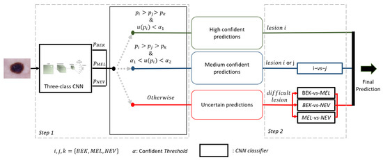 In the first step, and the three set of are used to cluster each input image x into three groups: high confidence, medium confidence and uncertain predictions. The division by group is based on Equation (4). and were determined by grid-search according to the balanced accuracy obtained by the framework on the validation set.