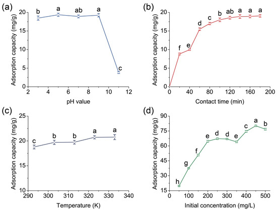 Effects of pH (a), contact time (b), temperature (c), and initial concentration (d) on MRCM adsorption of methyl orange at 303 K. (The reaction conditions in (a–c) are: the concentration of methyl orange is 50 mg/L, and the amount of MRCM is 0.1 g. The reaction conditions in (d) are: the reaction temperature is 30 °C, and the amount of MRCM is 0.1 g. Different letters in each of Figure (a–d) mean significant difference at 0.05 level (p < 0.05, n = 3).