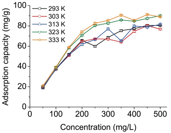 Figure 3c illustrates changes in the adsorption capacity of MRCM against methyl orange with temperature. The adsorption capacities at 323 K and 333 K were significantly higher than those at the other three lower temperatures (p < 0.05). It can be concluded that the equilibrium adsorption capacity was enhanced with an increase in temperature, indicating an endothermic reaction.