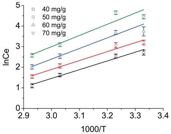 where R is the gas constant (8.314 J/K·mol), T is the absolute temperature (K), Ce (mg/L) is the adsorption equilibrium concentration, ΔH is the isosteric adsorption enthalpy (kJ/mol), and K is the adsorption equilibrium constant [42]. The adsorption isosteres ln Ce − 1/T (ln Ce given by Langmuir equation) could be obtained by using the adsorption isotherm of methyl orange onto MRCM at different temperatures. Figure 5 illustrates the adsorption enthalpy of adsorption methyl orange onto MRCM. The correlation was excellent at all the initial concentrations. Therefore, in the temperature range of this study, it is reasonable that the hypothesis ΔH in the derivation of this formula is independent of T. The slope (ΔH/R) corresponding to adsorption quantity and the isosteric enthalpy ΔH could be calculated by the linear regression method (Table 8). As Q increased from 40 to 70 mg/g, ΔH increased. The methyl orange adsorption onto MRCM was confirmed to be endothermic. That is, an increase in temperature favors the adsorption, denoted by the positive ΔH values.
