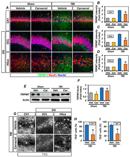 Carvacrol reduced TRPM7 over-expression and intracellular free zinc accumulation after TBI: (A) Double-label confocal micrographs representing neuronal marker NeuN+ neuronal nuclei (red) co-labeled with the TRPM7 (green) in the CA1, GCL, and hilus of ipsilateral hippocampus from vehicle- and carvacrol-treated groups 12 h after sham surgery or TBI. Nuclei are stained with DAPI (blue). Scale bar, 20 µm; (B–D) quantification of the immunofluorescence intensity of TRPM7 (green), as determined in the same CA1 (B), GCL (C), and hilus (D) regions of the ipsilateral hippocampus (mean ± SEM; n = 3–6 per group). * p < 0.05 vs. vehicle-treated TBI group (Kruskal–Wallis test followed by Bonferroni posthoc test: CA1: Chi square = 14.294, df = 3, p = 0.003; GCL: Chi square = 14.294, df = 3, p = 0.003; hilus: Chi square = 14.399, df = 3, p = 0.002); (E) Western blot of TRPM7 in the ipsilateral hippocampus; (F) bar graphs showing the quantification of TRPM7 protein amounts from the ipsilateral hippocampus (mean ± SEM; n = 3–4 per group). * p < 0.05 vs. vehicle-treated TBI group (Kruskal–Wallis test followed by Bonferroni post-hoc test: CA1: Chi square = 8.71, df = 3, p = 0.0334); (G) representative images showing sections of the ipsilateral hippocampus stained with TSQ for the detection of the accumulation of intracellular free zinc. Scale bar, 25 µm; and (H,I) bar graphs showing the number of TSQ+ neurons in the CA1 (H) and DG (I) of the ipsilateral hippocampus (mean ± SEM; n = 3 per group). * p < 0.05 vs. vehicle-treated TBI group (unpaired Student’s t-test).