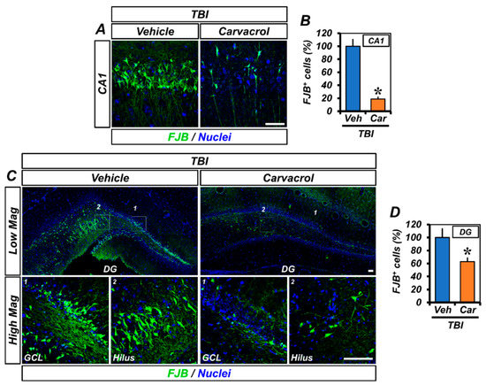 As carvacrol administration resulted in the inhibition of TRPM7 over-expression and zinc accumulation, we assessed the effect of carvacrol on the prevention of TBI-induced neuronal injury. First, we performed Fluro-Jade B (FJB) staining in brains harvested 24 h after TBI to detect degenerating neurons. TBI administration led to remarkable neuronal degeneration. FJB-stained cells emerged in the CA1 and DG regions of the ipsilateral hippocampus (Figure 2A,C). The number of FJB+ cells in the carvacrol-treated group was significantly lower than in the vehicle-treated group (Figure 2B,D).