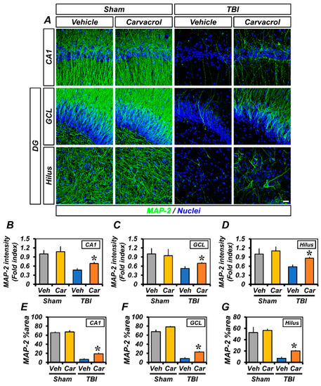 Next, we assessed dendritic damage in the ipsilateral hippocampus using Microtubule-associated protein 2 (MAP-2) immunofluorescence staining. As previously reported, TBI causes a significant loss of dendritic proteins—a characteristic of dendritic damage—within 24 h after the insult [19]. Sham-operated groups showed neutral MAP-2+ expression in dendrites of the hippocampal CA1, GCL, and hilus. Mice between vehicle- and carvacrol-treated groups showed no differences in fluorescence intensity and %area of MAP-2 immunoreactivity (IR). Both intensity and %area of MAP-2 IR were remarkably decreased 24 h after TBI, compared with the sham-operated groups. However, we observed a significant increase in MAP-2 IR in the carvacrol-treated TBI group, compared with the vehicle-treated TBI group. A similar trend was seen for the MAP-2 %area (Figure 3). Taken together, these data suggest that carvacrol treatment reduced neuronal damage after TBI.