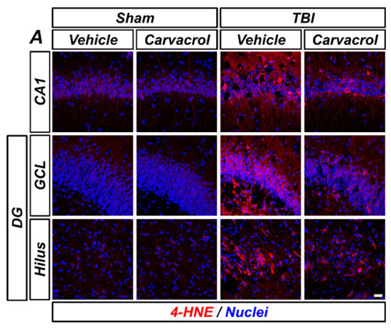 2.3. Carvacrol Treatment Reduced TBI-Induced Oxidative Stress