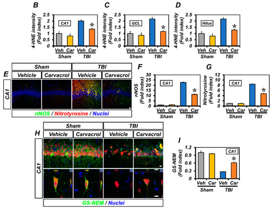TBI is well-known to induce oxidative stress by increasing the generation of reactive oxygen and nitrogen species (ROS/RNS) and subsequent lipid peroxidation [20]. We hypothesized that carvacrol could reduce TBI-induced oxidative stress. First, we assessed lipid peroxidation in the ipsilateral hippocampus using immunofluorescence staining. The molecule 4-HNE, the major end-product of lipid peroxidation, has been widely accepted as an inducer of oxidative stress [21,22]. TBI led to an increase in 4-HNE fluorescence in the hippocampal CA1, GCL, and hilus, while 4-HNE fluorescence intensity was significantly attenuated by carvacrol treatment (Figure 4A–D). Next, we examined the effect of carvacrol on nitrotyrosine formation and NO production caused by TBI. We observed the fluorescence signal of nNOS and nitrotyrosine in the hippocampal CA1 after TBI, which was significantly reduced by carvacrol treatment (Figure 4E–G). Furthermore, as oxidative stress can also significantly alter the cellular redox status by depleting cellular sulfhydryl compounds, we evaluated whether carvacrol affected neuronal glutathione (GSH). Sections were histologically stained by probing for GSH-N-ethylmaleimide (NEM) adducts (GS-NEM), in order to detect the reduced form of GSH in neurons. There were no significant differences in GS-NEM IR between vehicle- and carvacrol-treated sham groups. Compared with the sham-operated groups, GS-NEM IR in the ipsilateral CA1 was significantly increased in the vehicle-treated group 24 h after TBI. In contrast, the carvacrol-treated TBI group revealed highly reduced IR to GS-NEM, compared to the vehicle-treated TBI group (Figure 4H,I). Taken together, these data imply that carvacrol treatment decreased oxidative stress after TBI.
