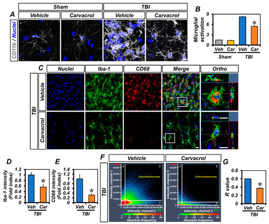 2.4. Carvacrol Treatment Reduced TBI-induced Microglial Activation