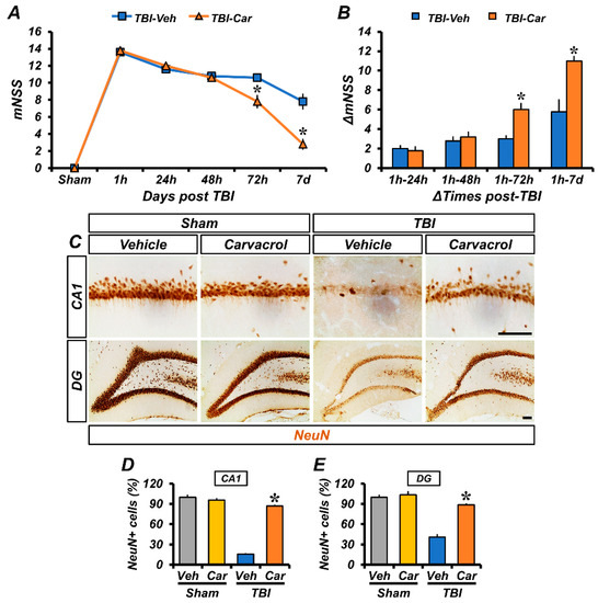 To determine whether carvacrol treatment could alleviate neurological dysfunction after TBI, we assessed the changes in the modified neurological severity score (mNSS) and calculated the variation in ΔmNSS over time. Following TBI, neurological deficits were evaluated at 1, 24, 48, and 72 h, as well as on the seventh day. Carvacrol treatment resulted in improved neurological function, as demonstrated by a decrease in mNSS (Figure 6A and Table 1) and an increase in ΔmNSS scores (Figure 6B), compared to the vehicle-treated group. As carvacrol improved neurological function, we also examined whether carvacrol could prevent TBI-induced neuronal death. Sham-operated groups showed intense staining of NeuN+ neurons in CA1 and DG. The number of NeuN+ stained neurons was decreased 7 days after TBI, compared to the sham-operated groups; however, the number of NeuN+ neurons in the carvacrol-treated group was significantly higher than that in the vehicle-treated group (Figure 6C–E). Taken together, these findings show that carvacrol treatment significantly prevented TBI-induced neuronal death and neurological impairment.