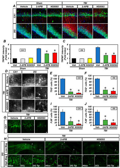 2-APB or NS8593 reduced TRPM7 over-expression, intracellular free zinc accumulation, and neuronal degeneration after TBI: (A) confocal micrographs representing the neuronal marker NeuN+ neuronal nuclei (green) co-labeled with the TRPM7 (red) in the CA1 and DG of the ipsilateral hippocampus from the vehicle-, 2-APB-, and NS8593-treated groups 12 h after sham surgery or TBI. Nuclei are stained with DAPI (blue). Scale bar, 20 µm; (B,C) quantification of the immunofluorescence intensity of TRPM7 (red) as determined in the same CA1 (B) and DG (C) regions of the ipsilateral hippocampus (mean ± SEM; n = 3–5 per group). * p < 0.05 vs. vehicle-treated TBI group (one-way analysis of variance (ANOVA) followed by Bonferroni post-hoc test; F = 39.76, p < 0.0001); (D) representative images showing sections of the ipsilateral hippocampus stained with TSQ for the detection of the accumulation of intracellular free zinc. Scale bar, 25 µm; (E,F) bar graphs showing the number of TSQ+ neurons in the CA1 (E) and DG (F) of the ipsilateral hippocampus (mean ± SEM; n = 4 per group). * p < 0.05 vs. vehicle-treated TBI group (one-way ANOVA followed by Bonferroni post-hoc test; (E): F = 93.91, p < 0.0001; (F): F = 20.46, p = 0.0004); (G,H) representative images showing sections of the hippocampal CA1 (G) and DG (H) stained with FJB to detect degenerating neurons. Scale bar, 20 µm; and (I,J) quantification of the number of FJB+ cells in the CA1 (I) and DG (J) of the ipsilateral hippocampus (mean ± SEM; n = 4–5 per group). * p < 0.05 vs. vehicle-treated TBI group (one-way ANOVA followed by Bonferroni post-hoc test; I: F = 9.459, p = 0.0041; J: F = 11.99, p = 0.0017).