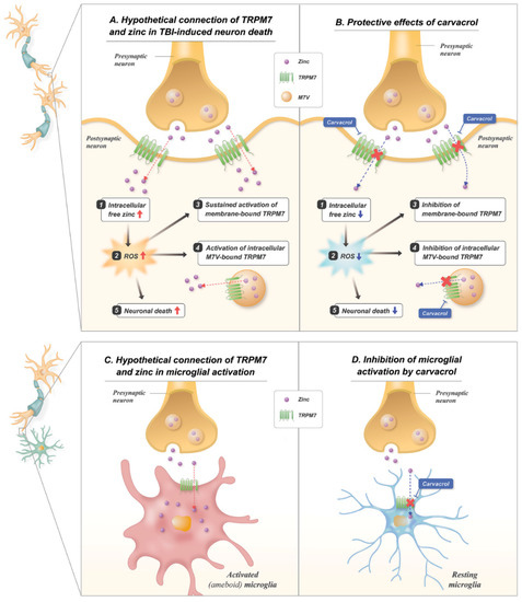 Proposed mechanisms for the effects of carvacrol on TBI-induced neuronal death and microglial activation. Schematic illustrations indicate the proposed action of carvacrol through inhibition of membrane-bound TRPM7 and intracellular vesicle-bound TRPM7 on neuronal death and microglial activation induced by TBI: (A) TBI induces the release of pre-synaptic zinc into the synapse, which translocates into the post-synaptic neurons through the TRPM7 channel. Increased zinc translocation contributes to the production of ROS. Increased ROS induces the activation of both membrane- and M7Vs-bound TRPM7, leading to the accumulation of free zinc in the cytosol, contributing to further ROS production. Eventually, zinc and ROS induce further neuronal injury; (B) carvacrol blocks the TRPM7 channels, leading to less translocation of zinc into the post-synaptic neurons after TBI. Inhibition of ROS production further leads to less activation of TRPM7, which is also blocked by carvacrol. Reduction in zinc reflux and ROS production reduces neuronal death; (C) synaptically released zinc gives rise to its influx into nearby microglia through TRPM7 channels, and this triggers microglial activation; (D) inhibition of TRPM7 by carvacrol can result in the suppression of zinc influx, thereby blocking microglial activation.