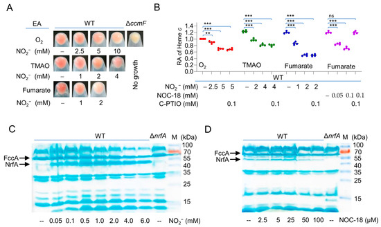 Nitrite and NO down-regulate cyt c content of S. oneidensis. (A) The cell color phenotypes. Shown are cell pellets of indicated strains grown on one of the EAs, O2, TMAO, and fumarate, to the early stationary phase. Strains include the wild-type (WT) and cyt-c-deficient ∆CcmF. (B) Heme c levels. Samples prepared as in (A) were lysed for quantification of heme c. NOC-18 and C-PTIO were used as the NO producer and scavenger, respectively. The data were first adjusted to the protein levels of the samples, and then, the averaged heme c levels of the mutants were normalized to that in the WT, which was set to 1, giving the relative abundance (RA). Asterisks indicate statistically significant difference of the values compared (n = 4; ns, not significant; **, p < 0.01; ***, p < 0.001). (C,D) Heme staining. Samples prepared the same as for the quantification of heme c were processed; the protein contents were quantified, and equal amounts of the proteins were separated in SDS-PAGE, then subjected to heme staining. M, molecular weight marker. FccA and NrfA are indicated by arrows. All experiments were performed three times, and representatives as in (A,C,D) are presented.