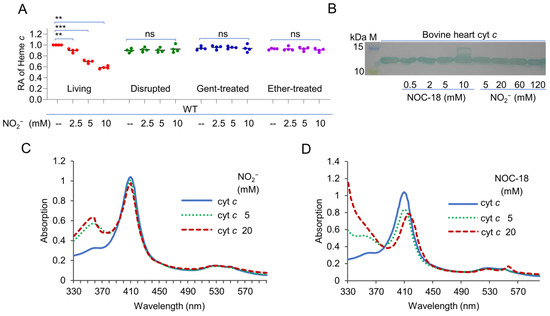 Nitrite and NO compromise the cyt c content in growing cells only. (A) Heme c levels. Cells at the early stationary phase were collected and processed by sonication or killed without destroying the cell morphology by treated with gentamycin or ether. All these samples were incubated with nitrite at varying concentrations for 5 h. Quantification of heme c was performed, and the data were processed as described in Figure 1b. Asterisks indicate statistically significant difference of the values compared (n = 4; ns, not significant; **, p < 0.01; ***, p < 0.001). (B) Heme staining. Bovine heart cyt c (2 μM) was incubated with nitrite and NO at the indicated concentrations for 5 h and then was examined by SDS-PAGE/heme staining. M, molecular weight marker. (C,D) UV–visible spectra of 5 μM cyt c solutions. Shown are untreated and treated with nitrite C or NOC-18 (D) at indicated concentrations for 5 h. In (B–D), experiments were performed three times, and a representative as in (B) and the averaged as in (C,D) are presented.