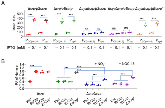 We reasoned that this can be assessed with Crp mutants that no longer require cAMP for activity. In E. coli, a Crp mutant, EcCrpT128L-S129I, showed a cAMP-independent DNA binding affinity comparable with that of cAMP-bound wild-type EcCrp [47]. In accord with the high sequence similarity (BLASTp E-value, 5e-139) between E. coli and S. oneidensis Crp proteins, EcCrp has been shown to be functional in S. oneidensis [35]. Despite this, the specific regulatory activity of EcCrp in S. oneidensis was determined with well-characterized CRP-dependent promoters, PCC(−41.5) and Pcyd. While PCC(−41.5) is a semisynthetic derivative of the melR promoter of E. coli, Pcyd directs transcription of the cyd operon encoding cyt bd oxidase in S. oneidensis [32,48]. DNA fragments for all Crp variants were placed under IPTG-inducible promoter Ptac within expression vector pHGE-Ptac used repeatedly in S. oneidensis [49]. As expected, EcCrp and EcCrpT128L-S129I, the same as SoCrp, could activate the expression of both promoters in the Δcrp strain in the presence of 0.1 mM IPTG (Figure 3A). Such an activating effect was still observed with EcCrpT128L-S129I in the absence of cAMP (ΔcrpΔcya, lacking all three genes for adenylate cyclases (ACs)), and in contrast, neither PCC(−41.5) nor Pcyd were responsive to the induced expression of EcCrp and SoCrp with up to 0.5 mM IPTG (Figure S3). These data validate that EcCrpT128L-S129I could function in a cAMP-independent manner as a transcriptional activator in S. oneidensis.