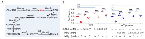 cyts c differ from other hemoproteins in that their heme b molecules are covalently attached to HBMs [2]. Given that heme is a substrate of cyt c, we hypothesized that the ligand may be a factor implicated in the reduced cyt c content caused by nitrite/NO. S. oneidensis possessing the common pathway for heme synthesis (Figure 4A), which entails nine reactions that convert glutamyl-tRNA to protoporphyrin IX [46,50]. HemA (glutamyl-tRNA reductase) catalyzes the first dedicated, rate-limiting step in heme synthesis [51] (Figure 4A). To test whether nitrite/NO affect the synthesis of heme, we assessed the impacts of nitrite/NO on the expression of the hemA gene, as well as two other hem genes and found that the impact was insignificant (Figure S4A). In line with this, we found that the nitrite/NO supplement did not significantly alter the heme levels in the cells (Figure S4B). Nevertheless, we continued to examine whether increased heme production could counteract the effect of nitrite/NO on the cyt c content. As 5-ALA is used exclusively for heme production and its synthesis is a critical focal point for the regulation of heme biosynthesis [51], we first determined if exogenous 5-ALA influences the cyt c contents of S. oneidensis cells. In line with the previous observations [52], the addition of 50 µM 5-ALA induced a noticeable increase in cyt c abundance, and a 35% increase was observed with 200 µM ALA (Figure 4B). A similar effect of 5-ALA addition was observed in the presence of nitrite/NO despite the overall lowered cyt c levels.