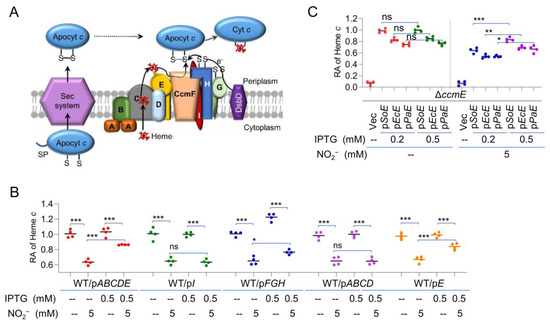 During our investigation, we noted that nitrite down-regulates the overall cyt c content, especially when fumarate is used as the electron acceptor (EA) to support growth [34]. This effect involves the cyclic adenosine monophosphate-catabolite repression protein (cAMP-Crp) transcriptional regulatory system, which mediates the transcription of a large number of genes encoding proteins involved in respiration, including many cyts c [32,34,35,36]. In this study, we first substantiate that the reduction in cAMP levels caused by nitrite or NO is not fully responsible for the decrease in the cyt c content in S. oneidensis. We then show that, although heme is implicated, its biosynthesis and cellular levels are not significantly affected by both of the nitrogen oxides. Further investigations reveal that nitrite and NO interfere with heme transport by compromising CcmE, leading to impaired cyt c biosynthesis.