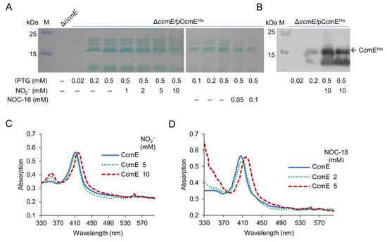 2.5. Identification of CcmE as a Likely Target of Nitrite/NO on cyt c Production