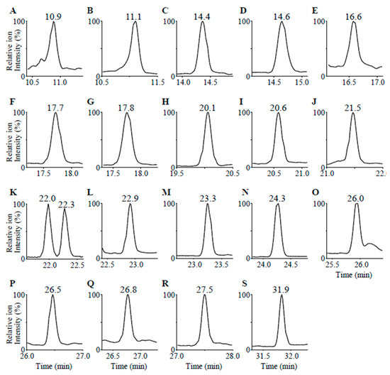Figure 1. Extracted ion chromatograms of steroid standard solution with each specific DT at concentrations of 10 ng/dL. The m/z values and DT conditions of the compounds for the extracted ion chromatogram are as follows (m/z value, DT): (A) 18-oxocortisol at (377.197, 56), (B) 18-hydroxycortisol at (379.213, 57), (C) 18-hydroxycorticosterone at (363.217, 55), (D) aldosterone at (361.200, 54), (E) 19-hydroxy-4-androstene-3,17-dione at (303.196, 44), (F) cortisone at (361.203, 55), (G) cortisol at (363.218, 56), (H) 11-ketotestosterone at (303.196, 44), (I) 18-hydroxy-11-deoxy corticosterone at (347.222, 54), (J) adrenosterone at (301.183, 43), (K) 21-deoxycortisol at (347.223, 52) and corticosterone at (347.223, 54), (L) 11-deoxycortisol at (347.225, 55), (M) 16α-hydroxyprogesterone at (331.228, 52), (N) 11β-hydroxyprogesterone at (331.227, 50), (O) testosterone at (289.217, 43), (P) 11-deoxycorticosterone at (331.229, 53), (Q) androstenedione at (287.202, 43), (R) 17α-hydroxyprogesterone at (331.229, 51), and (S) progesterone at (315.233, 49).