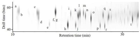 Figure 2. Two-dimensional plots of drift time–retention time (DT-RT) in the RT range of 10–33 min, DT 38–65 bins, and m/z 285–380. 18-oxoF (a), 18-OHF (b), 18-OHB (c), aldosterone (d), 19-OHA4 (e), cortisone (f), cortisol (g), 11-KT (h), 18-OH-DOC (i), adrenosterone (j), 21-deoxycortisol (k), corticosterone (l), 11-deoxycortisol (m), 16α-OHP (n), 11β-OHP (o), testosterone (p), DOC (q), androstenedione (r), 17α-OHP (s), and progesterone (t).