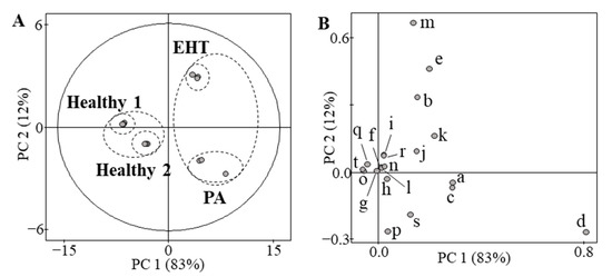 Figure 3. Principal component analysis (PCA) in the steroid profiling of four human serum samples. (A) Score plots. There are three plots in each serum. The plots model 20 steroids detected in LC/IM/MS of all sera. The X-axis and Y-axis describe the first and second principal components (PCs), respectively. Each sample was measured in triplicate for PCA. The PCAs were performed with the [steroid peak area obtained from each subject]/[average of steroid peak area obtained from healthy subject 1 (n = 3)]. These PCA plots were created using the relative value of steroids. PCA analysis shows that the distribution of steroid profiles differs significantly among individuals. (B) Loading plots. The PCA loading plots are provided for 20 steroids of 18-oxoF (a), 18-OHF (b), 18-OHB (c), aldosterone (d), 19-OHA4 (e), cortisone (f), cortisol (g), 11-KT (h), 18-OH-DOC (i), adrenosterone (j), 21-deoxycortisol (k), corticosterone (l), 11-deoxycortisol (m), 16α-OHP (n), 11β-OHP (o), testosterone (p), DOC (q), androstenedione (r), 17α-OHP (s), and progesterone (t).