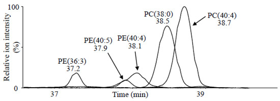 Figure 4. Overlaid extracted ion chromatograms via selection of m/z values of phosphatidylcholine (PC) (38:0), PC(40:4), phosphatidylethanolamine (PE) (36:3), PE(40:4), and PE(40:5) from a patient with PA in the range of RT 36.5–40.0 min using non-target LC/IM/MS.