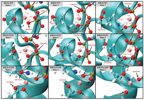 Noncovalent interactions, such as hydrogen bonds and coordination bonds (), are important for proteins to maintain their tertiary structure as well as for protein–cofactor interactions. We analyzed the structure of the three different KRAS isoforms in the aqueous ionic solution by time-dependent atomic site–site distances between selected atomic sites to find out and estimate interactions between Mg and KRAS (Figure A7). The full set of averaged values and lifetimes of / are also reported in Table A2 and Table A3 of Appendix A. We selected in Figure 1 representative snapshots from the total computed length of 5 s, where the pattern and mechanism of the formation and breaking of involving Mg are clearly seen. Interestingly, cofactor Mg exhibits a unique role in the conformational change of KRAS-G12D, while having little influence on KRAS-WT and KRAS-G12C. As shown in Figure 1, for the KRAS-G12D case, Mg can form with SER17 (oxygen labeled ‘O2’, see Figure A2), ASP57 (O1, O2) of KRAS-G12D and oxygens O1B and O2B of GDP (state 1). During the first 500 ns, is in a dynamic fluctuation and can be formed and broken (state 2). In the next 1.5 s, bonds and are broken. Finally, Mg forms strong with GDP (O1B), ASP57 (O1) and SER17 (O2) (state 3). In KRAS-WT and KRAS-G12C cases, the interaction patterns of Mg with KRAS and GDP are similar to each other, but they are very different from the KRAS-G12D case. In particular, Mg forms CB with SER17 (O2) and O2A, O1B, and O2B atoms of GDP, while the lifetimes of Mg-SER17 (O2) and Mg-GDP (O1B) are rather short. Once the bond was broken, Mg was subsequently released from the binding site of KRAS-SER17.
