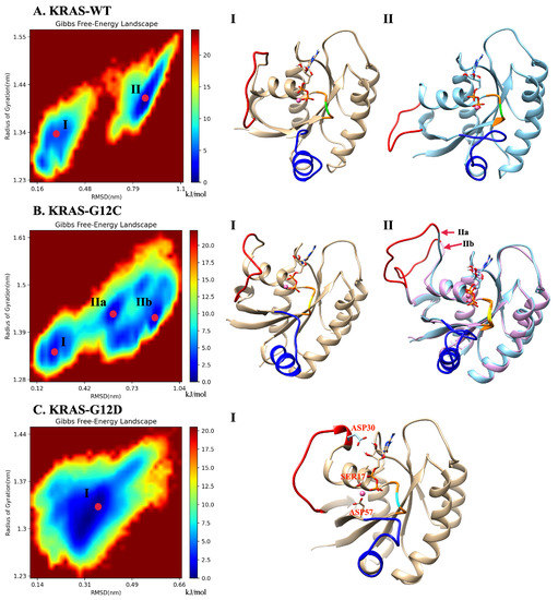 Gibbs free energy profiles are of high significance to characterize the dominant conformations of KRAS during simulation. In the present work, such analytical tools will allow us to directly track the effects of GLY12 mutations on the dominant conformations of the KRAS. Since the main movement of the protein is concentrated in SW-I and SW-II and our main research object is KRAS-GDP-Mg ternary complex, we chose to compute Gibbs free energy landscapes by using two specific variables, including RMSD and radius of gyration, see below. The method employed to obtain the free energy profiles is the so-called “principal component analysis” [61,62], where the components RMSD and work as reaction coordinates (Figure 2). In the KRAS-WT case, we detected two free energy basins (I, II). Basin II is the one with lowest free energy (set to 0 kJ/mol), and it was chosen as the reference so that basin I shows a barrier of 4.6 kJ/mol, when transitions from basins I to II are considered. These two Gibbs free energy basins represent the two main stable states of KRAS-WT during MD simulations. We can obtain from the MD trajectories that in state I, SW-I is slightly open, while in the dominant basin II, SW-I opens largely and SW-II tends to be closer to the P-loop (region containing the mutated codon 12 and depicted in orange color). Several Gibbs free energy basins were also detected in the KRAS-G12C. In this case, the representative conformation of basin I is similar to the corresponding one in KRAS-WT, while basin II is divided into several small energy basins, with IIa and IIb as examples. The dominant conformation is now located on basin IIb (0 kJ/mol), with basin I at 2.7 kJ/mol and basin IIa at 1.0 kJ/mol. These basins are separated by low free energy barriers and they are moderately easy to access by the system. The differences between basins IIa and IIb are mainly on SW-I, with the SW-I conformation of IIb being more open than that of IIa. The comparison between KRAS-WT, KRAS-G12C and KRAS-G12D shows a clear difference: a single Gibbs free energy basin is found for KRAS-G12D, which indicates that such species have only one dominant stable conformation. As it can be seen from the representative crystal structure of this particular free energy basin I (Figure 2C), this dominant conformation of KRAS-G12D corresponds to SW-I being slightly open, while the distance between SW-II and P-loop is relatively tight. This is because the strong interaction of Mg with GDP (O1B), SER17 (O2) and ASP57 (O1) can stabilize the distance between SW-II, GDP and the -helix of KRAS, where SER17 is located. We also observed that the ASP12 shows strong interaction with GLY60 and GLN61, both located at SW-II. At the same time, hydrogen atoms H2 and H3 of GDP can form stable interactions with ASP30, helping to stabilize the distance between SW-I and GDP. To corroborate the full convergence of the free energy landscapes reported in Figure 2, we report in Appendix A (Figure A9) the contribution of the two independent 2.5 s trajectories that we employed in this work (A,B), compared with their average (C), as shown in Figure 2C.