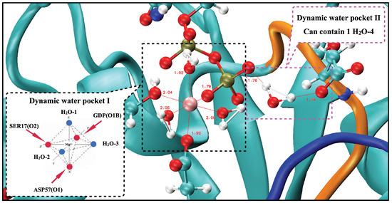 From the previous analysis, KRAS-G12D exhibited a stable conformation that was significantly different from those of KRAS-WT and KRAS-G12C, and Mg exhibited a unique binding mode in the KRAS-G12D surface. Mg can form strong interactions with GDP (O1B), SER17 (O2) and ASP57 (O1). Well-established experimental results [51,52] showed that the octahedral structure is the most stable structure for Mg first shell coordination, which is fully consistent with our simulation results. When we take into account the interaction of KRAS-GDP-Mg complexes in aqueous Mg-Cl solution, we find the dynamic water pocket I in the Mg binding area (left side of Figure 3). We call it “dynamic” in the following sense: in the octahedral structure of Mg, the fluctuation frequencies of the coordinated water molecules (in positions HO-1, HO-2 and HO-3) are lower than those of free water molecules in solution, i.e., the former remain in their positions for much longer periods of time than the latter (nanoseconds compared to the picosecond time scale for bulk water dynamics [63]). At the same time, the coordinated water molecules can be exchanged with other water molecules in the solution (Figure A10). Further analysis of the trajectory uncovered another dynamic water pocket II, which is located between the phosphate group of GDP and the ASP12 (right side of Figure 3). This dynamic pocket can accommodate only one HO molecule, through interactions of HO with GDP (O2B) and ASP12 (O1/O2) (Figure A11). Further, the water molecule in this pocket is in a dynamic fast exchange with other water molecules in the solution. For the sake of corroboration of the newly observed pockets I and II, we included in Appendix A (see Figure A12) a comparison of the location of the pocket reported by Kessler et al. [28] with the pockets reported in the present work.