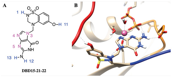 In order to target the newly revealed binding pockets, we designed a drug in silico able to block GDP at its main cavity in a permanent way. There are several identified ways to target KRAS, the following being the most relevant [64]: inhibition of RAS expression, interference with RAS post-translational modifications, inhibition of RAS function or targeting specific downstream effectors. Furthermore, our strategy is different from that of the designers of recent drug Sotorasib [65]. We observed that in recent years, selective binding ligands for Mg have gradually become known [66]. In dynamic water pocket I, HO-2 and HO-3 molecules can exchange with other water molecules in the aqueous solution. The two oxygen atoms of HO-2 and HO-3 are on the same horizontal plane, and the distance between the two oxygen atoms is comparable to the size of the bidentate ligand. This feature makes it possible to design the selective inhibitors that can replace these two water molecules and target this dynamic water pocket I. Herein, we designed a series of inhibitors for these two dynamic water pockets using a benzothiadiazine, specifically 3,4-dihydro-1,2,4-benzothiadiazine-1,1-dioxide (C7H8N2O2S, DBD), as a template. The most suitable species obtained is designed as DBD15-21-22 (see Figure 4A) since it is a DBD derivative, similar to some of those reported in Ref. [67].