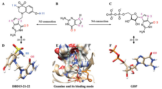DBD15-21-22 cannot bind to the GDP/GTP binding pocket of KRAS-WT: (A) 2D structure of DBD15-21-22; (B) 2D structure of guanine; (C) 2D structure of GDP; (D) 3D structure of DBD15-21-22 in water; (E) GDP-binding model of KRAS-WT; (F) 3D structure of GDP in water.