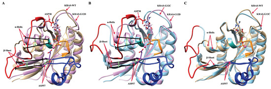 Alignment of three representative dominant structures of the GDP-bound KRAS-WT, KRAS-G12C and KRAS-G12D. (A) Alignment of GDP-bound KRAS-WT and GDP-bound KRAS-G12D; (B) alignment of GDP-bound KRAS-G12C and GDP-bound KRAS-G12D; (C) alignment of GDP-bound KRAS-WT and GDP-bound KRAS-G12C.