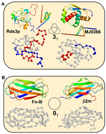 - Millett, K.C.; Rawdon, E.J.; Stasiak, A.; Sułkowska, J.I. Identifying knots in proteins. Biochem. Soc. Trans. 2013, 41, 533–537. [Google Scholar] [CrossRef] [PubMed]