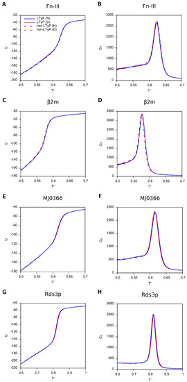 Internal energy, U, and heat capacity, , as functions of the reduced temperature, (see Section 4). Simulations starting from the native conformation (N) are colored blue, and those starting from a denatured conformation (D) are colored red. Continuous lines correspond to LTyP simulations and dashed lines to non-LTyP simulations. (A,B) Fn-III (PDB id: 1TEN). (C,D) 2m (PDB id: 1BMG). (E,F) MJ0366 (PDB id: 2EFV). (G,H) Rds3p (PDB id: 2K0A).