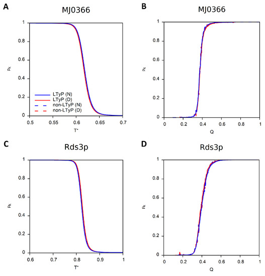 Knotting probability, , as function of reduced temperature and of Q. Simulations starting from native conformation (N) are colored blue and those starting from a denatured conformation (D) are colored red. Continuous lines correspond to LTyP simulations and dashed lines to non-LTyP simulations. (A,B) MJ0366 (PDB id: 2EFV). (C,D) Rds3p (PDB id: 2K0A).