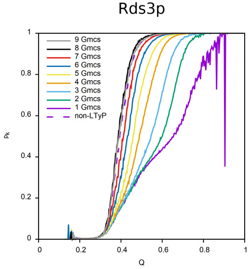 To illustrate the progress of the relaxation process under LTyP, we report in Figure 4 the knotting probability, , as function of Q, for protein Rds3p and simulations starting from a denatured conformation, for numbers of mcs of relaxation ranging from (1 Gmcs) to (9 Gmcs). For this particular case, only after mcs can the simulation be considered in equilibrium.