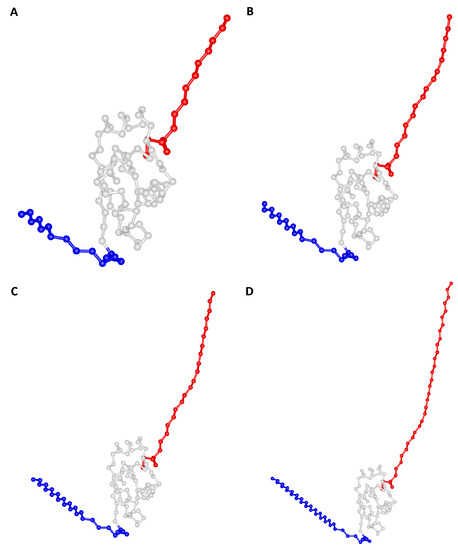 MJ0366 with (A) 5 alanines added to each tail resulting in N and C tails with 15 residues (N15C15), (B) 10 alanines added to each tail resulting in N and C tails with 20 residues (N20C20), (C) 15 alanines added to each tail resulting in N and C tails with 25 residues (N25C25) and (D) 25 alanines added to each tail resulting in N and C tails with 35 residues (N35C35); residues in the N-tail are colored blue, residues in the knotted core are colored grey, and residues in the C-tail are colored red.