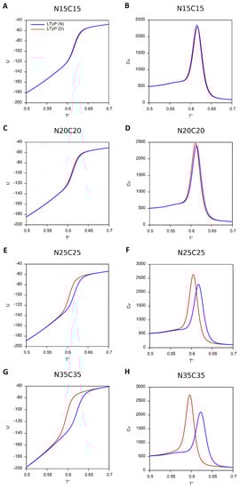 Internal energy, U, and heat capacity, , as functions of reduced temperature for MJ0366 with tails of increasing length. Simulations starting from native conformation (N) are colored blue and those starting from a denatured conformation (D) are colored red. (A,B) N15C15. (C,D) N20C20. (E,F) N25C25. (G,H) N35C35.