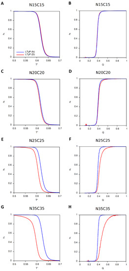 Knotting probability, , as function of reduced temperature and of Q for MJ0366 with tails of increasing length. Simulations starting from native conformation (N) are colored blue and those starting from a denatured conformation (D) are colored red. (A,B) N15C15. (C,D) N20C20. (E,F) N25C25. (G,H) N35C35.